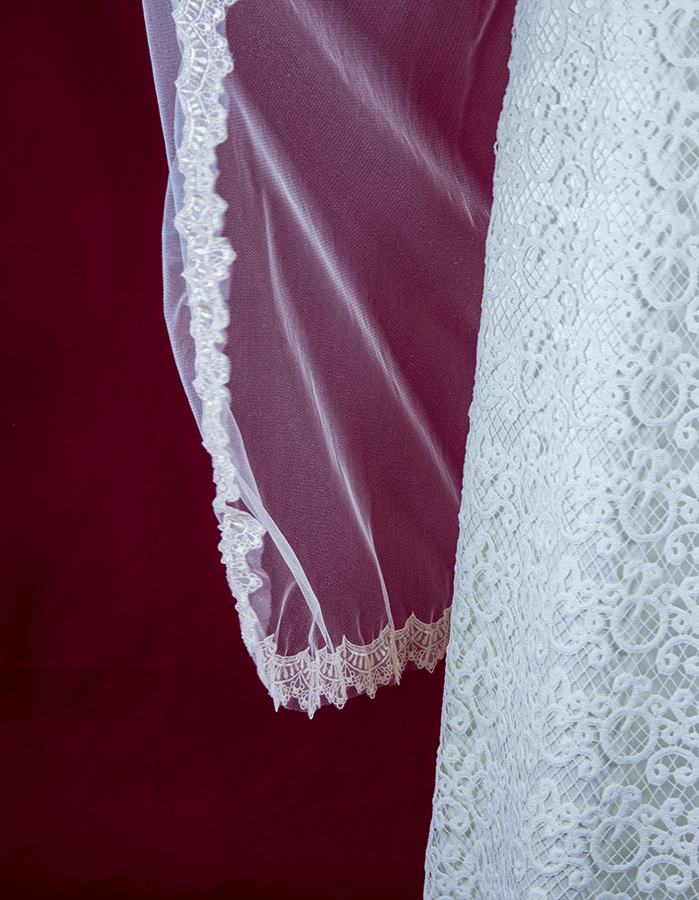 Ivory Ankle veil full gold lace trim has no front piece. With a see through clip.