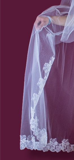 Snow white ankle veil with beaded lace trip at bottom, has a front piece. With a see through clip