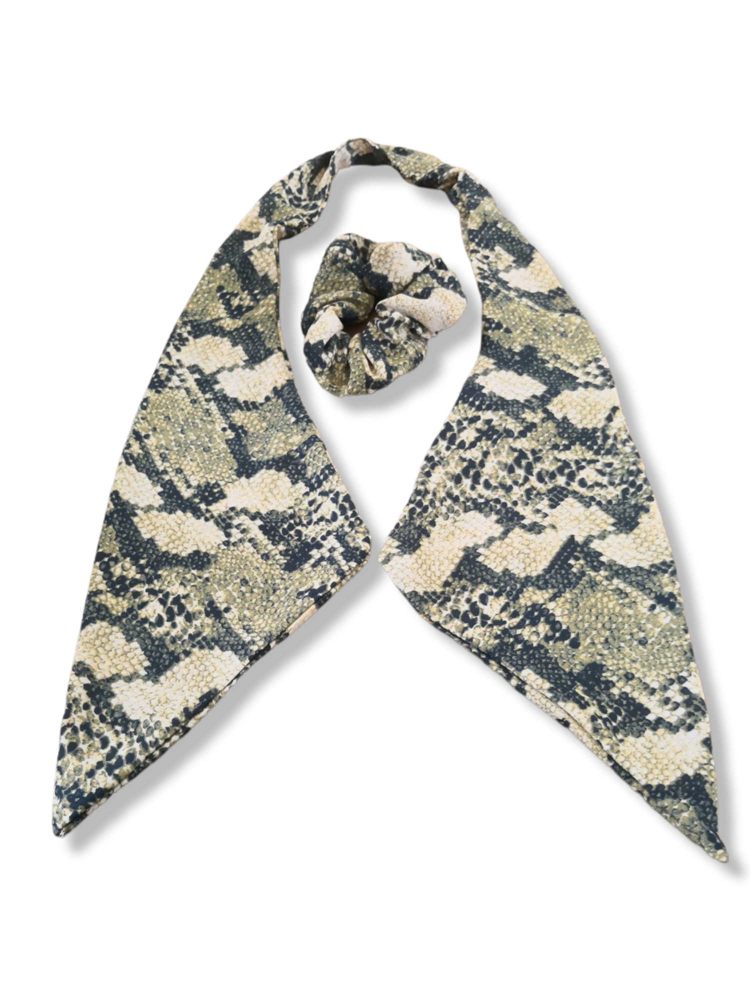 Printed scrunchie with removable scarf. Elegant and adds that special feature to your look. For the working working women or and other women who wants to keep her hair out the way on her busy day.