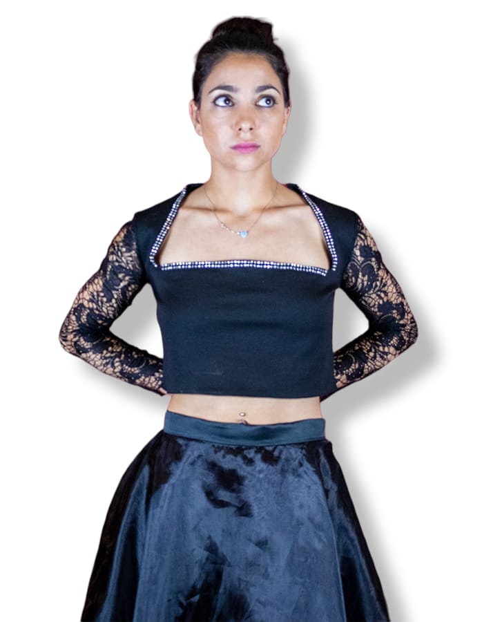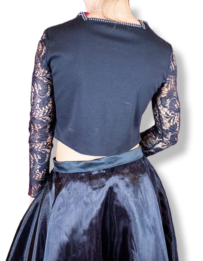 Crop formal top that has lace long sleeves square neckline with bead accent on neckline.